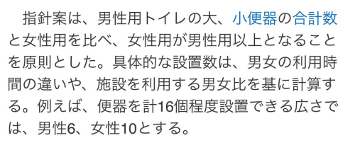 【17位】『男性用トイレの大、小便器の合計数と女性用を比べ、』 『女性用が男性用以上となることを原則』 ↑ はあああ!?!?!? これ日本人女性はおかしいと思わないの!? 自分達の得になるならOKってか?